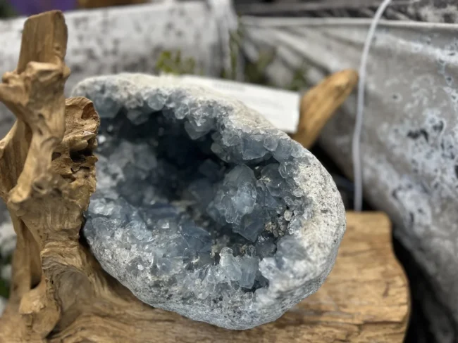 Celestite is a gorgeous blue crystal that is often found in sedimentary rocks and geodes in Madagascar.